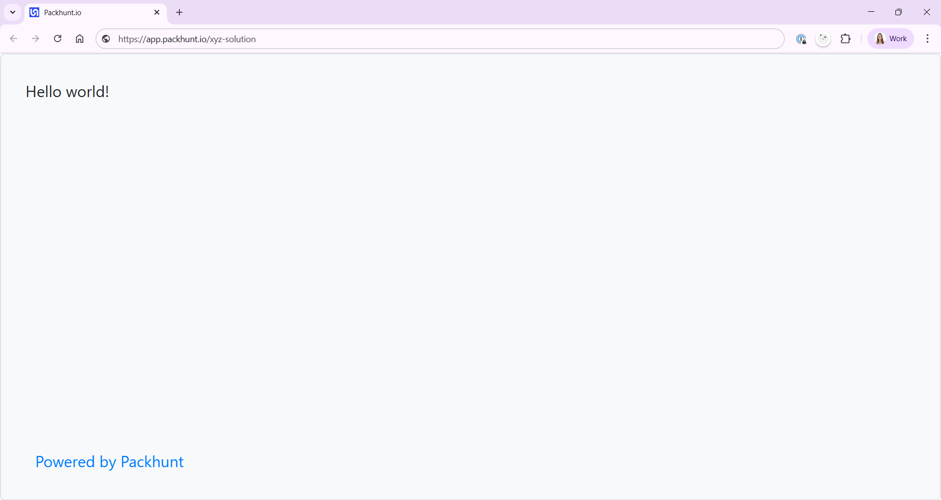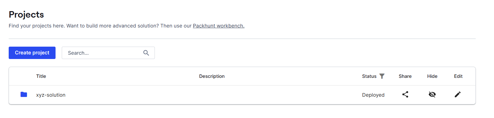 Running deployment for solution 'xyz-solution' in organisation 'johnsmith' √ Running checks √ Deploying template √ Deploying project Successfully deployed solution 'xyz-solution' 🚀 Your solution is available at: https://app.packhunt.io/xyz-solution